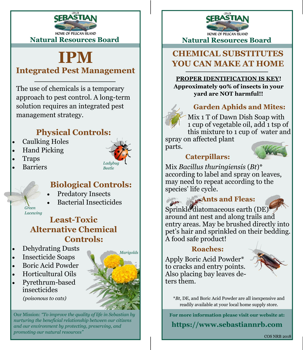 The City of Sebastian Leisure Services Department is proud to present the newly created Integrated Pest Management Plan for City Parks and Properties. At the October 14th, 2020 City Council meeting Resolution No. R-20-12 was approved supporting the Integrated Pest Management Plan for Parks and Properties that was developed by the IPM Sub-Committee.